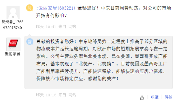 爱丽家居[603221] :中东地缘局势一定程度上推高了部分区域的物流成本并延长运输周期,对欧洲市场的短期拓展节奏存在一定影响。公司主营业务聚焦北美市场,已在美国、墨西哥完成产能布局,基本实现了“北美产、北美销”。目前美国及墨西哥工厂产能利用率持续提升、产能快速释放,能够快速响应客户需求,保障核心市场稳定供应。
