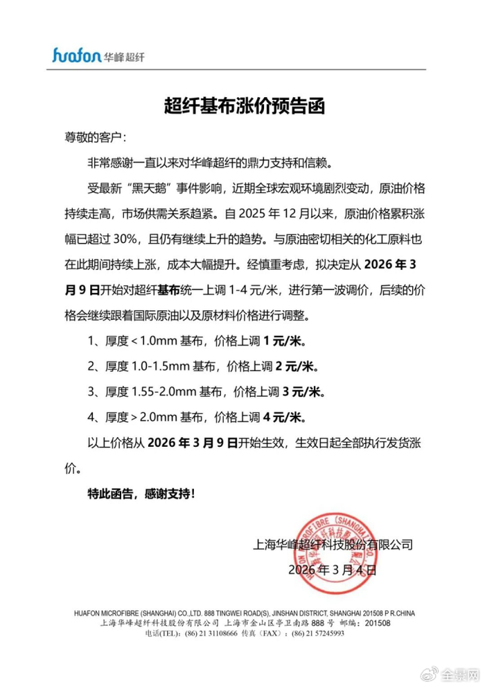 华峰超纤[300180] :受最新“黑天鹅”事件影响,近期全球宏观环境剧烈变动,原油价格持续走高,市场供需关系趋紧。自2025年12月以来,原油价格累积涨幅已超过30%,且仍有继续上升的趋势。与原油密切相关的化工原料也在此期间持续上涨,成本大幅提升。经慎重考虑,拟决定从2026年3月9日开始对超纤基布统一上调1元-4元/米,进行第一波调价,后续的价格会继续跟着国际原油以及原材料价格进行调整。