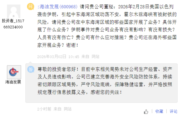海油发展[600968] :目前中东相关局势未对公司生产经营、资产及人员造成影响。公司已建立完善海外安全风险防控体系,持续密切跟踪区域局势,严守风险底线,保障稳健运营,并严格按照规定履行信息披露义务。