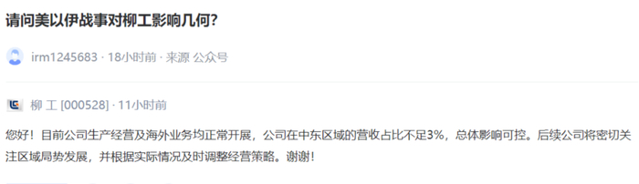 柳工[000528] :目前公司生产经营及海外业务均正常开展,公司在中东区域的营收占比不足3%,总体影响可控。后续公司将密切关注区域局势发展,并根据实际情况及时调整经营策略。