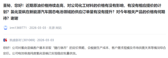 凯盛新材[301069] :公司对氯化亚砜客户基本采取“随行就市”的定价策略,会根据生产成本、客户需求规模及市场供需关系等情况综合定价。公司电池级高纯度氯化亚砜已实现稳定批量供货。