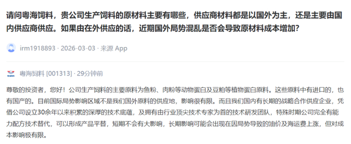 粤海饲料[001313] :公司生产饲料的主要原料为鱼粉、肉粉等动物蛋白及豆粕等植物蛋白原料。这些原料中有进口的,也有国产的。目前国际局势影响区域不是我们国外原料的供应地,影响很有限。而且我们国内有长期的战略合作供应企业,凭借公司设立30余年以来积累的深厚的技术底蕴,及拥有由行业顶尖技术专家为首的技术研发团队,特殊时期公司完全有能力配方技术替代,可以形成产品平替,短期不会有大影响,长期影响可能会出现在因局势导致的油价及海运费上涨,但对成本影响极有限。