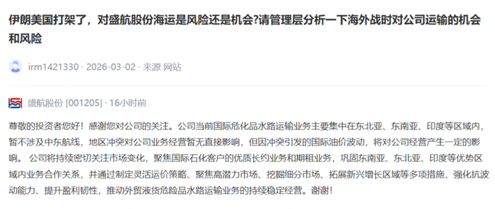 盛航股份[001205] :公司当前国际危化品水路运输业务主要集中在东北亚、东南亚、印度等区域内,暂不涉及中东航线,地区冲突对公司业务经营暂无直接影响,但因冲突引发的国际油价波动,将对公司经营产生一定的影响。公司将持续密切关注市场变化,聚焦国际石化客户的优质长约业务和期租业务,巩固东南亚、东北亚、印度等优势区域内业务合作关系,并通过制定灵活运价策略、聚焦高潜力市场、挖掘细分市场、拓展新兴增长区域等多项措施,强化抗波动能力、提升盈利韧性,推动外贸液货危险品水路运输业务的持续稳定经营。