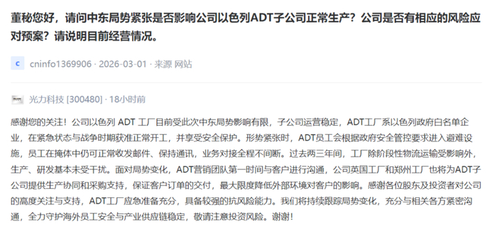 光力科技[300480] :公司以色列ADT工厂目前受此次中东局势影响有限,子公司运营稳定,ADT工厂系以色列政府白名单企业,在紧急状态与战争时期获准正常开工,并享受安全保护。形势紧张时,ADT员工会根据政府安全管控要求进入避难设施,员工在掩体中仍可正常收发邮件、保持通讯,业务对接全程不间断。过去两三年间,工厂除阶段性物流运输受影响外,生产、研发基本未受干扰。面对局势变化,ADT营销团队第一时间与客户进行沟通,公司英国工厂和郑州工厂也将为ADT子公司提供生产协同和采购支持,保证客户订单的交付,最大限度降低外部环境对客户的影响。感谢各位股东及投资者对公司的高度关注与支持,ADT工厂应急准备充分,具备较强的抗风险能力。我们将持续跟踪局势变化,充分与相关各方紧密沟通,全力守护海外员工安全与产业供应链稳定,敬请注意投资风险。