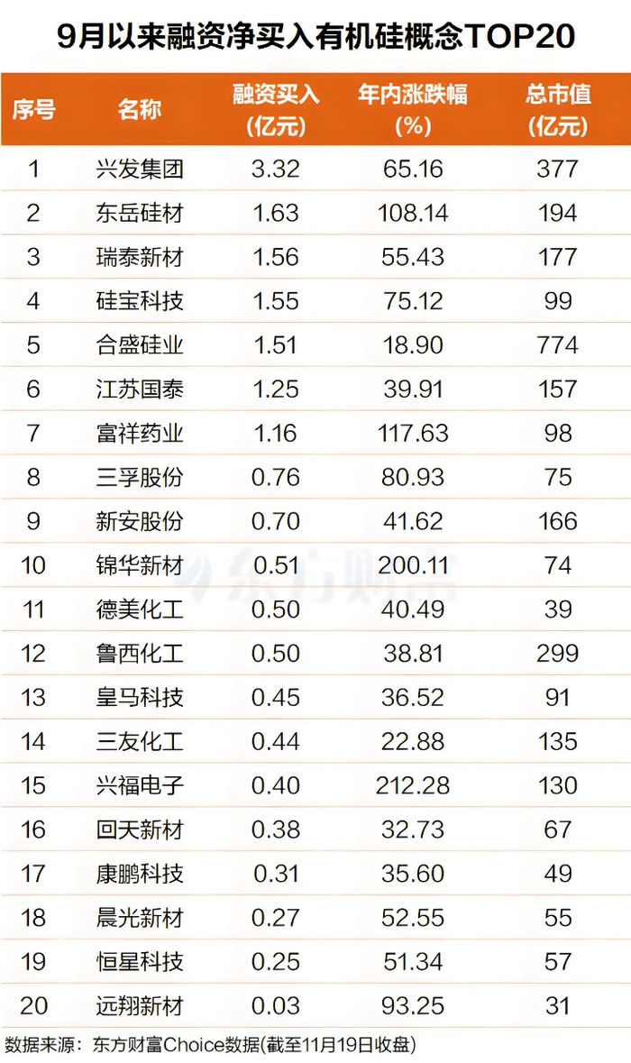 东方财富Choice数据显示,自9月以来,杠杆资金净买入多只有机硅概念股,其中兴发集团排名第一,融资净买入超3亿元;东岳硅材排名第二,融资净买入1.63亿元。