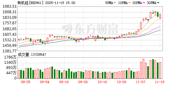 涨价概念正在扩散!继六氟磷酸锂、VC概念之后,周三(11月19日)有机硅概念爆发。个股方面,远翔新材涨超11%,东岳硅材涨超10%,晨光新材涨停,走出3天2板,合盛硅业大涨近9%,宏柏新材、硅宝科技等多股跟涨。