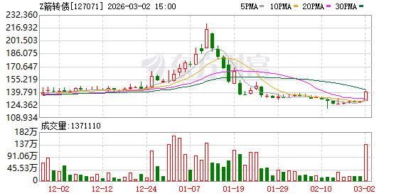 3月2日,首华转债与天箭转债均进入最后一个交易日。受地缘政治因素影响,美以伊冲突升级推动相关板块走强,首华转债与天箭转债的正股价格均实现大幅上涨,首华燃气今日收盘涨幅达19.82%,中天火箭则是以10%涨停收盘。在正股强势带动下,首华转债上涨17.19%,天箭转债涨幅亦达9.55%,市场交易活跃度显著提升。