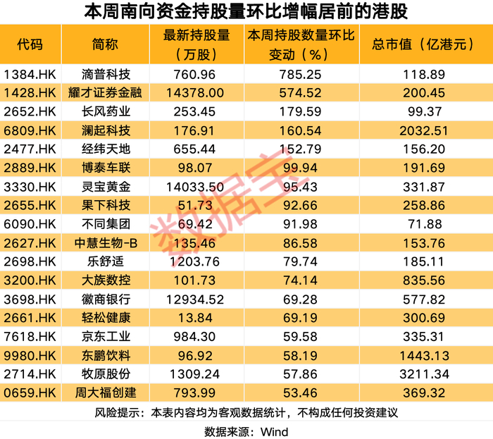 本周18股获得南向资金持股量环比增长超50%。