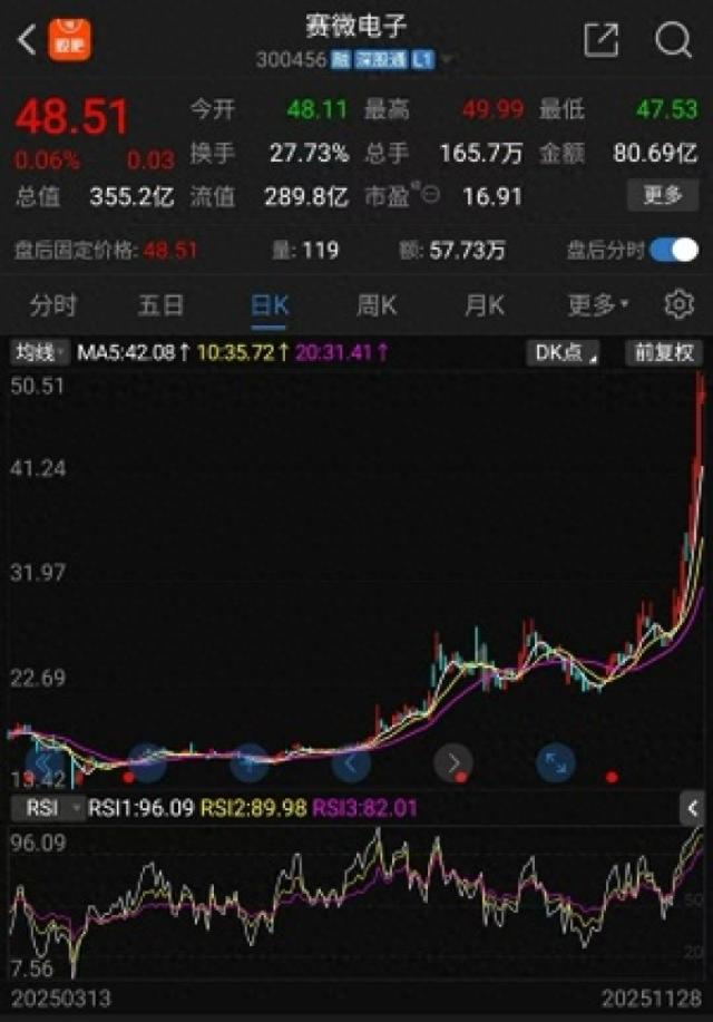 在这场技术革命中,赛微电子凭借在CPO核心器件领域的显著优势,成为资金追捧的焦点。截至11月28日收盘,公司股价为48.51元/股,总市值超过350亿元。11月以来,赛微电子股价合计上涨了98.08%,今年以来累计上涨超180%。