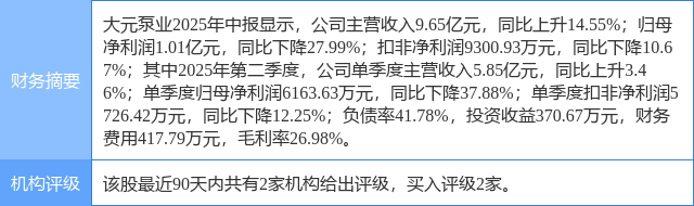 2025年8月26日,天风证券研究员周嘉乐,郭丽丽,朱晔,宗艳,金昊田发布了对大元泵业的研报《家用板块修复,液冷泵放量在即》,该研报对大元泵业给出“买入”评级。证券之星数据中心根据近三年发布的研报数据计算,该研报作者对此股的盈利预测准确度为64.96%。