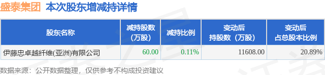 证券之星消息,9月26日盛泰集团发布公告《盛泰集团:盛泰智造集团股份有限公司关于持股5%以上股东权益变动触及1%刻度的提示性公告》,其股东伊藤忠卓越纤维(亚洲)有限公司于2025年9月24日合计减持60.0万股,占公司目前总股本的0.108%,变动期间该股股价上涨0.39%,截止9月24日收盘报7.67元。