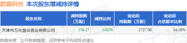 证券之星消息,10月8日欧晶科技发布公告《欧晶科技:关于持股5%以上股东减持计划实施完成暨减持结果的公告》,其股东天津市万兆慧谷置业有限公司于2025年9月4日至2025年9月29日间合计减持158.27万股,占公司目前总股本的0.8226%,变动期间该股股价下跌2.11%,截止9月29日收盘报26.89元。
