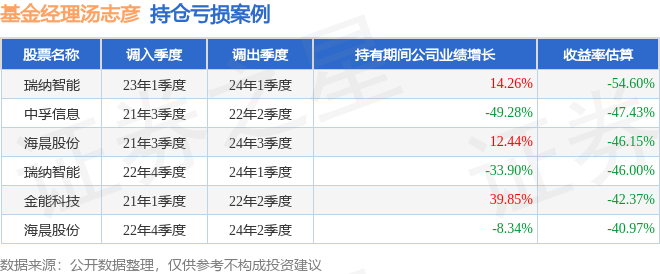 汤志彦管理的鹏华安庆混合A基金在23年1季度买入瑞纳智能,在持有1年又0个季度后在24年1季度卖出。持有期间的估算收益率为-54.6%,持有期间瑞纳智能在2023年到2024年的年报归属净利润增幅达14.26%。