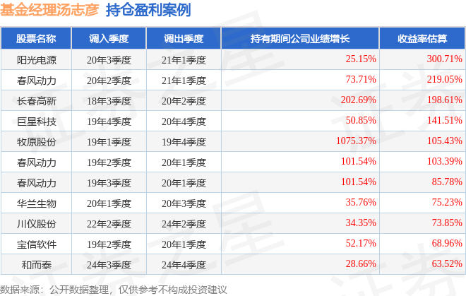 汤志彦管理的鹏华弘嘉混合A基金在20年3季度买入阳光电源,在持有2个季度后在21年1季度卖出。持有期间的估算收益率为300.71%,持有期间阳光电源在2020年到2021年的年报营业总收入增幅达25.15%。