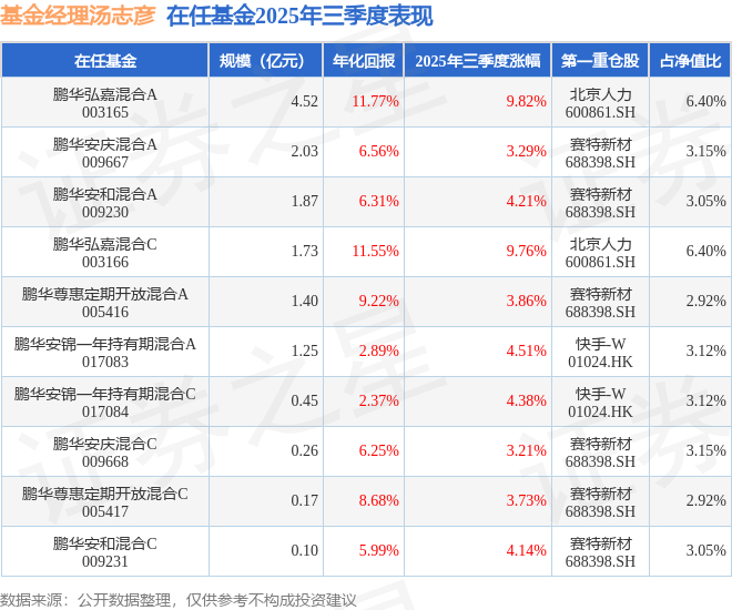 证券之星消息,截止2025年三季度末,基金经理汤志彦旗下共管理10只基金,本季度表现最佳的为鹏华弘嘉混合A(003165),季度净值涨9.82%。
