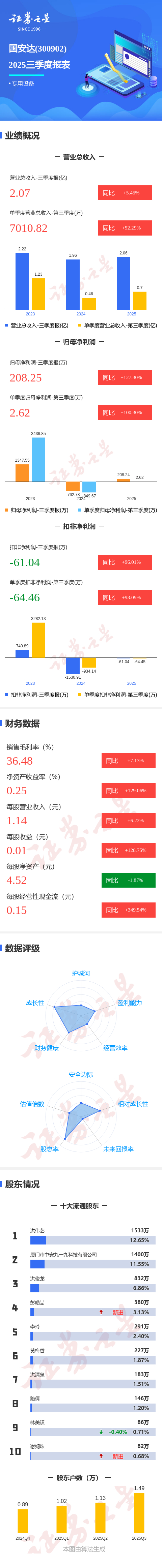 证券之星消息,国安达2025年三季报显示,公司主营收入2.07亿元,同比上升5.45%;归母净利润208.25万元,同比上升127.3%;扣非净利润-61.04万元,同比上升96.01%;其中2025年第三季度,公司单季度主营收入7010.82万元,同比上升52.29%;单季度归母净利润2.62万元,同比上升100.31%;单季度扣非净利润-64.46万元,同比上升93.1%;负债率13.31%,投资收益67.73万元,财务费用-35.37万元,毛利率36.48%。