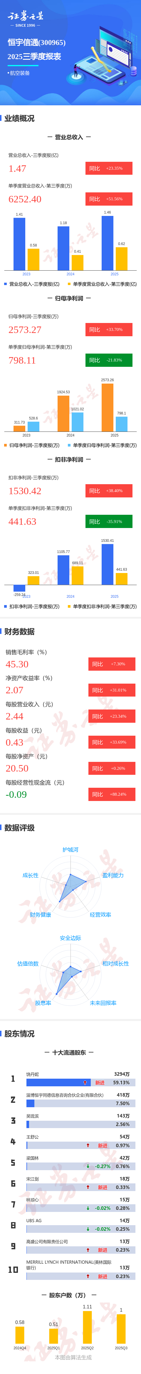 证券之星消息,恒宇信通2025年三季报显示,公司主营收入1.47亿元,同比上升23.35%;归母净利润2573.27万元,同比上升33.71%;扣非净利润1530.42万元,同比上升38.4%;其中2025年第三季度,公司单季度主营收入6252.4万元,同比上升51.57%;单季度归母净利润798.11万元,同比下降21.83%;单季度扣非净利润441.63万元,同比下降35.91%;负债率16.8%,投资收益816.24万元,财务费用-22.73万元,毛利率45.3%。