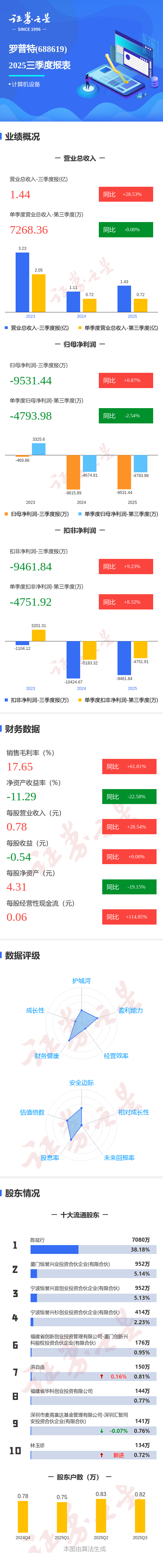 证券之星消息,罗普特2025年三季报显示,公司主营收入1.44亿元,同比上升28.54%;归母净利润-9531.44万元,同比上升0.88%;扣非净利润-9461.84万元,同比上升9.24%;其中2025年第三季度,公司单季度主营收入7268.36万元,同比下降0.01%;单季度归母净利润-4793.98万元,同比下降2.55%;单季度扣非净利润-4751.92万元,同比上升8.32%;负债率42.6%,投资收益-170.41万元,财务费用304.6万元,毛利率17.65%。
