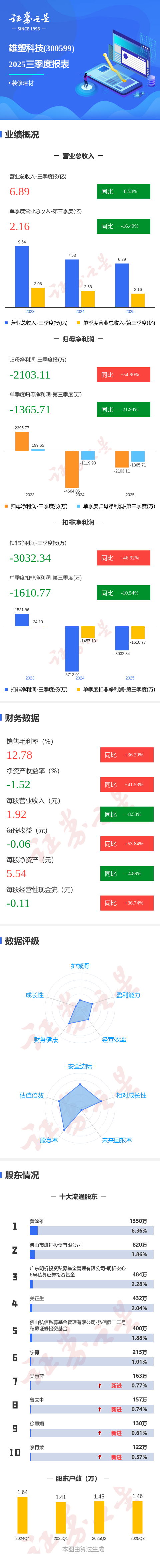 证券之星消息,雄塑科技2025年三季报显示,公司主营收入6.89亿元,同比下降8.54%;归母净利润-2103.11万元,同比上升54.91%;扣非净利润-3032.34万元,同比上升46.92%;其中2025年第三季度,公司单季度主营收入2.16亿元,同比下降16.5%;单季度归母净利润-1365.71万元,同比下降21.95%;单季度扣非净利润-1610.77万元,同比下降10.54%;负债率12.26%,投资收益504.62万元,财务费用-249.53万元,毛利率12.78%。