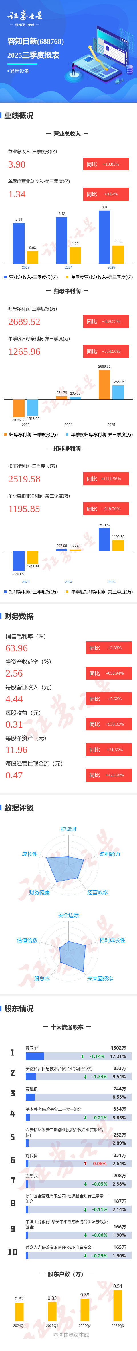 证券之星消息,容知日新2025年三季报显示,前三季度公司主营收入3.9亿元,同比上升13.86%;归母净利润2689.52万元,同比上升889.54%;扣非净利润2519.58万元,同比上升1111.57%;其中2025年第三季度,公司单季度主营收入1.34亿元,同比上升9.05%;单季度归母净利润1265.96万元,同比上升514.56%;单季度扣非净利润1195.85万元,同比上升618.3%;负债率21.75%,投资收益108.05万元,财务费用-100.19万元,毛利率63.96%。