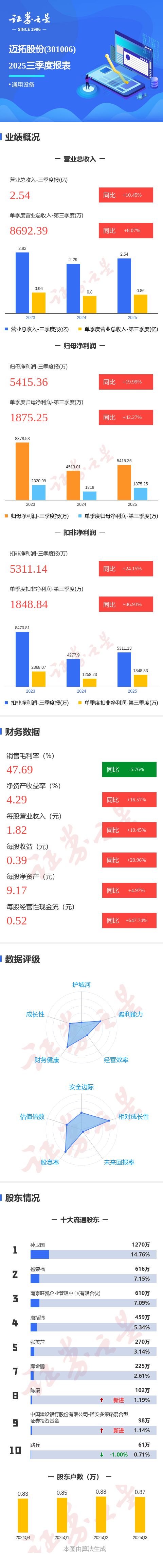 证券之星消息,迈拓股份2025年三季报显示,前三季度公司主营收入2.54亿元,同比上升10.45%;归母净利润5415.36万元,同比上升19.99%;扣非净利润5311.14万元,同比上升24.15%;其中2025年第三季度,公司单季度主营收入8692.39万元,同比上升8.08%;单季度归母净利润1875.25万元,同比上升42.28%;单季度扣非净利润1848.84万元,同比上升46.94%;负债率12.89%,投资收益83.66万元,财务费用-474.2万元,毛利率47.69%。