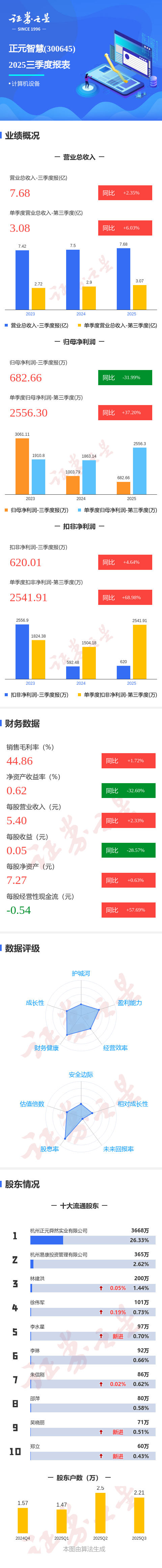 证券之星消息,正元智慧2025年三季报显示,前三季度公司主营收入7.68亿元,同比上升2.35%;归母净利润682.66万元,同比下降31.99%;扣非净利润620.01万元,同比上升4.64%;其中2025年第三季度,公司单季度主营收入3.08亿元,同比上升6.03%;单季度归母净利润2556.3万元,同比上升37.2%;单季度扣非净利润2541.91万元,同比上升68.99%;负债率55.42%,投资收益-382.6万元,财务费用2702.45万元,毛利率44.86%。