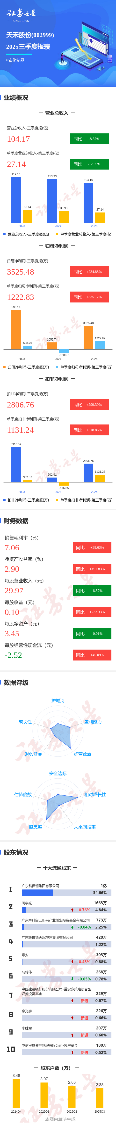 证券之星消息,天禾股份2025年三季报显示,前三季度公司主营收入104.17亿元,同比下降8.57%;归母净利润3525.48万元,同比上升234.88%;扣非净利润2806.76万元,同比上升299.3%;其中2025年第三季度,公司单季度主营收入27.14亿元,同比下降12.39%;单季度归母净利润1222.83万元,同比上升335.13%;单季度扣非净利润1131.24万元,同比上升318.87%;负债率76.79%,投资收益324.36万元,财务费用5089.06万元,毛利率7.06%。