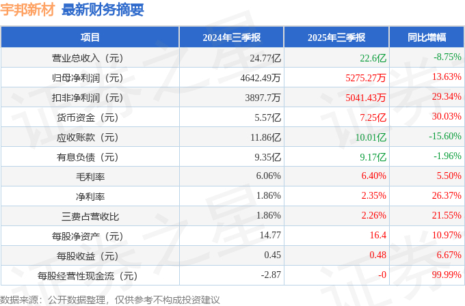 据证券之星公开数据整理,近期宇邦新材(301266)发布2025年三季报。截至本报告期末,公司营业总收入22.6亿元,同比下降8.75%,归母净利润5275.27万元,同比上升13.63%。按单季度数据看,第三季度营业总收入7.42亿元,同比下降6.59%,第三季度归母净利润1674.24万元,同比上升59.75%。本报告期宇邦新材盈利能力上升,毛利率同比增幅5.5%,净利率同比增幅26.37%。