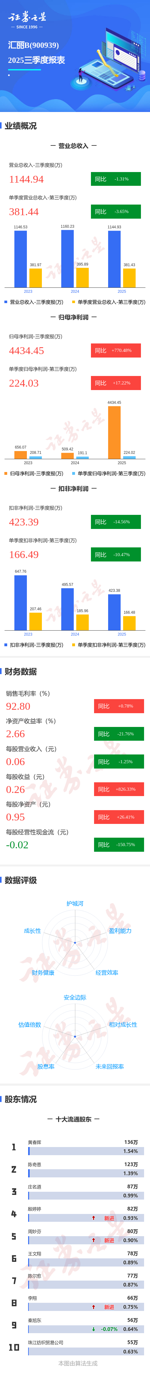证券之星消息,汇丽B2025年三季报显示,前三季度公司主营收入1144.94万元,同比下降1.32%;归母净利润4434.45万元,同比上升770.48%;扣非净利润423.39万元,同比下降14.57%;其中2025年第三季度,公司单季度主营收入381.44万元,同比下降3.65%;单季度归母净利润224.03万元,同比上升17.23%;单季度扣非净利润166.49万元,同比下降10.47%;负债率11.89%,投资收益5154.67万元,财务费用-160.22万元,毛利率92.8%。