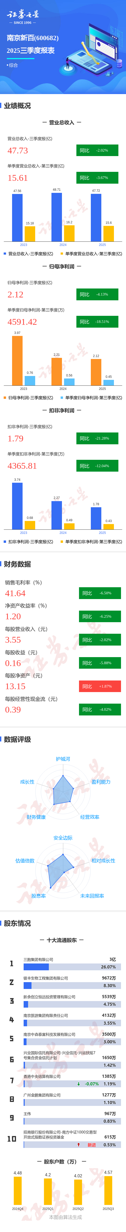 证券之星消息,南京新百2025年三季报显示,前三季度公司主营收入47.73亿元,同比下降2.02%;归母净利润2.12亿元,同比下降4.14%;扣非净利润1.79亿元,同比下降21.28%;其中2025年第三季度,公司单季度主营收入15.61亿元,同比下降3.67%;单季度归母净利润4591.42万元,同比下降18.51%;单季度扣非净利润4365.81万元,同比下降12.04%;负债率26.47%,投资收益4924.33万元,财务费用-3433.0万元,毛利率41.64%。
