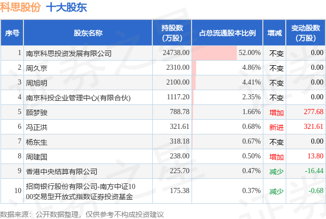 根据科思股份2025年三季报公布的十大股东详情如下: