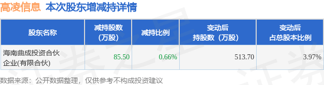 证券之星消息,11月6日高凌信息发布公告《高凌信息:股东减持股份计划时间届满暨减持股份结果公告》,其股东海南曲成投资合伙企业(有限合伙)于2025年10月10日至2025年10月13日间合计减持85.5万股,占公司目前总股本的0.6612%,变动期间该股股价上涨1.56%,截止10月13日收盘报24.77元。