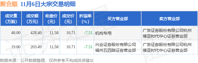证券之星消息,11月6日聚合顺发生大宗交易,交易数据如下: