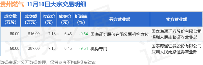 证券之星消息,11月10日贵州燃气发生大宗交易,交易数据如下: