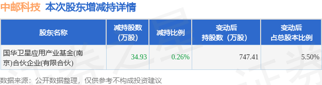 证券之星消息,11月10日中邮科技发布公告《中邮科技:关于持股5%以上股东权益变动触及1%刻度的提示性公告》,其股东国华卫星应用产业基金(南京)合伙企业(有限合伙)于2025年10月16日至2025年11月10日间合计减持34.93万股,占公司目前总股本的0.2568%,变动期间该股股价下跌8.69%,截止11月10日收盘报57.76元。