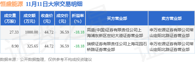 证券之星消息,11月11日恒盛能源发生大宗交易,交易数据如下: