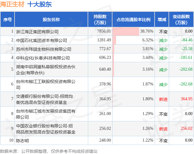 根据海正生材2025年三季报公布的十大股东详情如下: