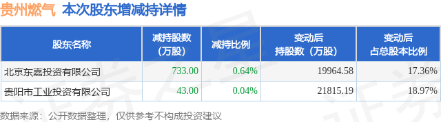 证券之星消息,11月12日贵州燃气发布公告《贵州燃气:贵州燃气集团股份有限公司持股5%以上股东减持股份结果公告》,其股东北京东嘉投资有限公司、贵阳市工业投资有限公司于2025年10月21日至2025年11月11日间合计减持776.0万股,占公司目前总股本的0.6748%,变动期间该股股价下跌5.31%,截止11月11日收盘报7.13元。