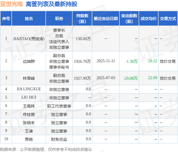 亚世光电的高管列表及最新持股情况如下: