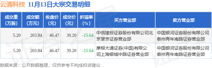 证券之星消息,11月13日云涌科技发生大宗交易,交易数据如下: