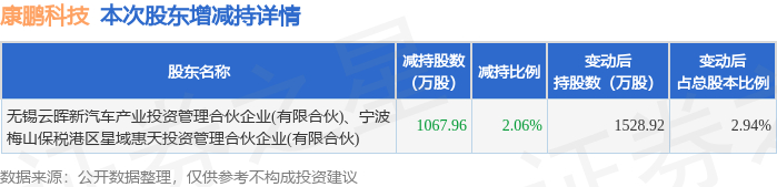 证券之星消息,11月14日康鹏科技发布公告《康鹏科技:股东减持股份结果公告》,其股东无锡云晖新汽车产业投资管理合伙企业(有限合伙)、宁波梅山保税港区星域惠天投资管理合伙企业(有限合伙)于2025年10月1日至2025年11月13日间合计减持1067.96万股,占公司目前总股本的2.0562%,变动期间该股股价上涨31.91%,截止11月13日收盘报11.45元。
