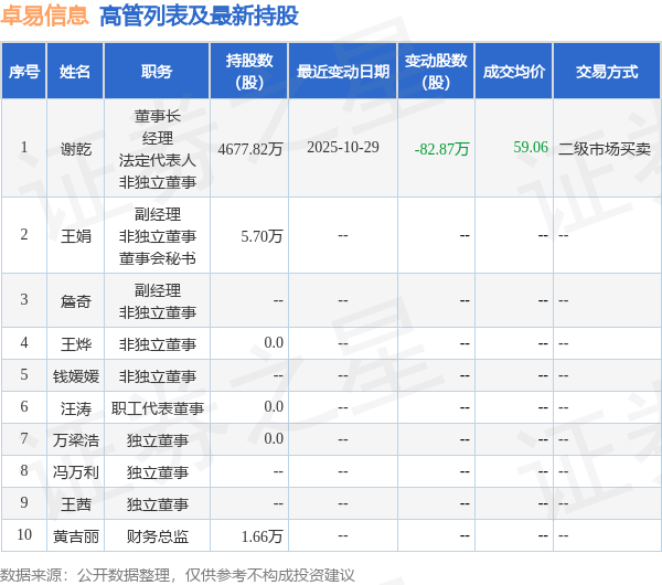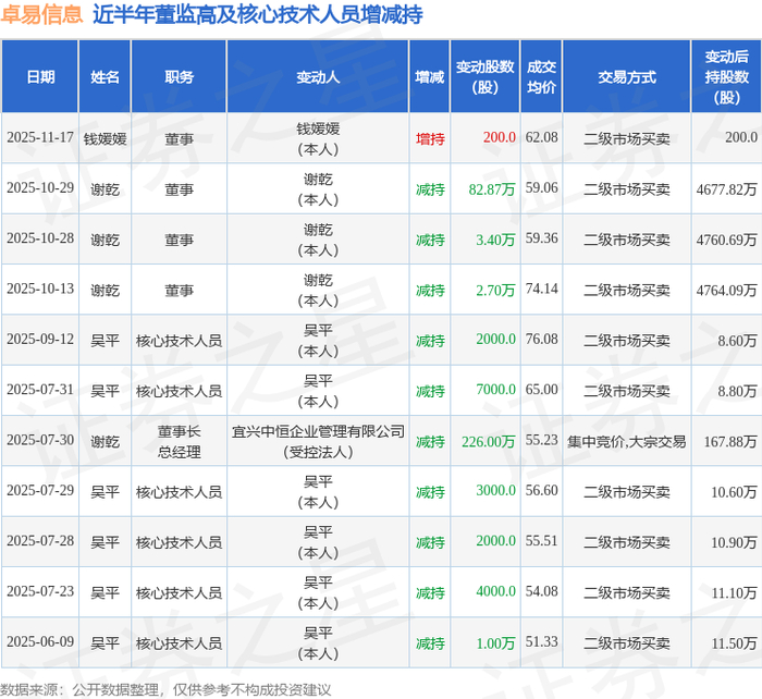 卓易信息近半年内的董监高及核心技术人员增减持详情如下: