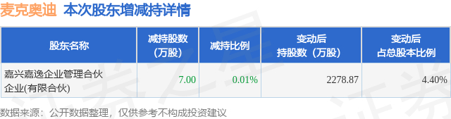 证券之星消息,11月20日麦克奥迪发布公告《麦克奥迪:关于公司股东减持股份计划期限届满的公告》,其股东嘉兴嘉逸企业管理合伙企业(有限合伙)于2025年9月27日至2025年10月28日间合计减持7.0万股,占公司目前总股本的0.0135%,变动期间该股股价下跌7.93%,截止10月28日收盘报17.77元。