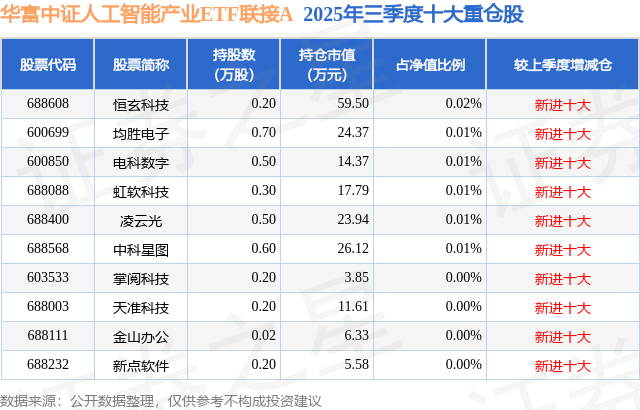根据2025基金Q3季报公募基金重仓股数据,重仓该股的公募基金共1家,其中持有数量最多的公募基金为华富基金的华富中证人工智能产业ETF联接A。华富中证人工智能产业ETF联接A目前规模为11.68亿元,最新净值1.3687(11月20日),较上一交易日上涨0.01%,近一年上涨57.79%。该公募基金现任基金经理为张娅 郜哲 李孝华。张娅在任的基金产品包括:华富中证5年恒定久期国开债指数A,管理时间为2019年1月28日至今,期间收益率为28.9%;华富中证人工智能产业ETF,管理时间为2019年12月24日至今,期间收益率为63.02%;华富中债-安徽信用债A,管理时间为2020年8月3日至今,期间收益率为22.65%。郜哲在任的基金产品包括:华富中证人工智能产业ETF,管理时间为2019年12月24日至今,期间收益率为63.02%;华富中证科创创业50指数增强A,管理时间为2022年8月31日至今,期间收益率为32.75%;华富中证港股通创新药指数型发起式A,管理时间为2025年6月5日至今,期间收益率为17.0%。李孝华在任的基金产品包括:华富中证A100ETF联接A,管理时间为2021年5月7日至今,期间收益率为0.36%;华富中证证券公司先锋策略ETF,管理时间为2021年6月28日至今,期间收益率为16.46%;华富中证稀有金属主题ETF,管理时间为2021年8月11日至今,期间收益率为-4.33%;华富中小企业100指数增强,管理时间为2021年11月17日至今,期间收益率为-18.71%。
