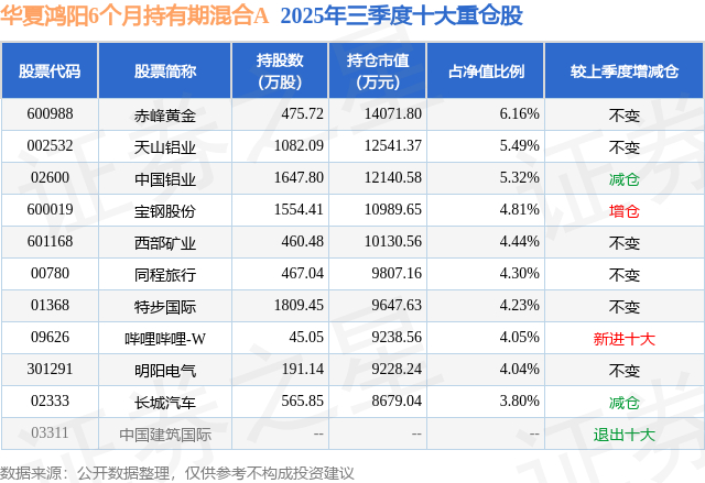 华夏鸿阳6个月持有期混合A的前十大重仓股如下: