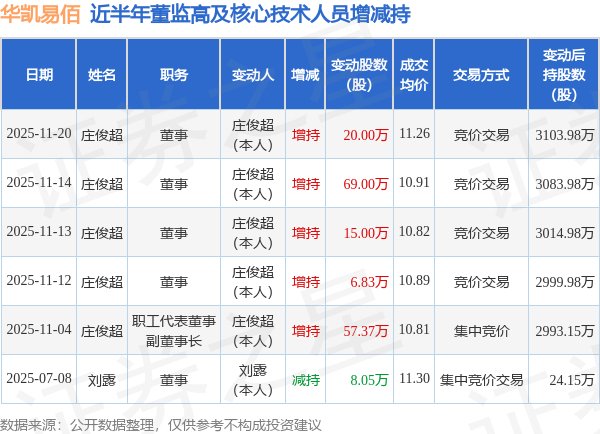 华凯易佰近半年内的董监高及核心技术人员增减持详情如下: