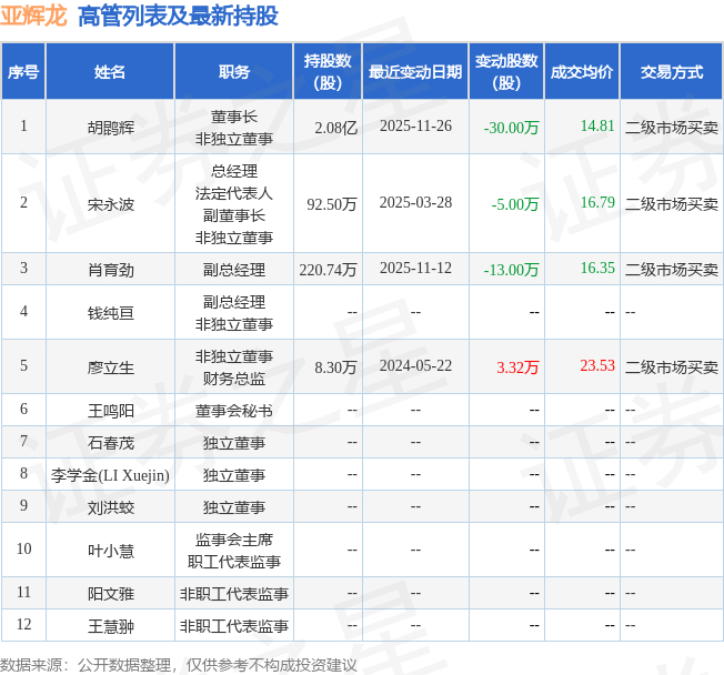 亚辉龙近半年内的董监高及核心技术人员增减持详情如下: