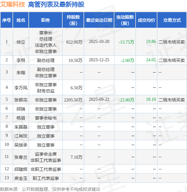艾隆科技近半年内的董监高及核心技术人员增减持详情如下: