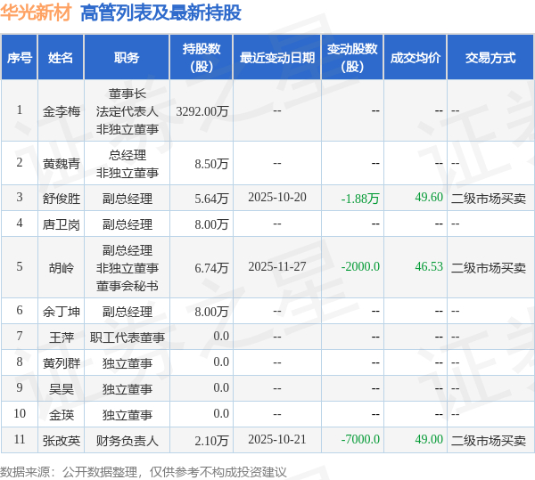 华光新材近半年内的董监高及核心技术人员增减持详情如下: