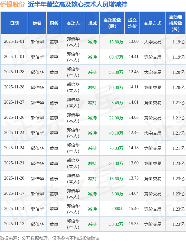侨银股份近半年内的董监高及核心技术人员增减持详情如下: